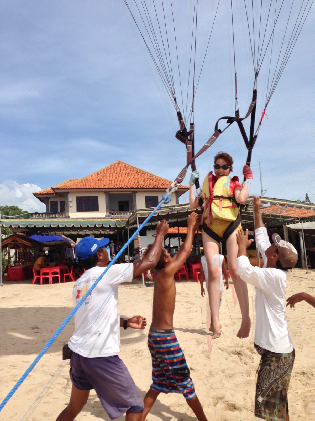 Permainan pertama kita parasailing, jadi pilih dari yang ga kena air sampai yang basah-basahan. Parasailing ini durasinya 1 kali putaran aja. Buat yang takut ketinggian, ilangin dehhh rasa takutmu, dijamin ga bakal jatuh hahahaha aku juga takut ketinggian tapi aku tetep coba n setelah dicoba pas diatas tu asikkk banget jadi ga pengen turunnnn.