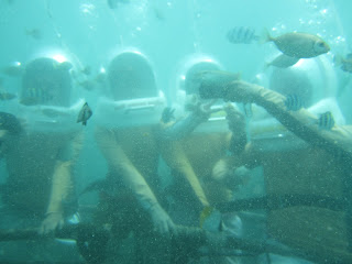 Permainan yang terakhir sea walker, yeeey kita akan berjalan didalam laut pake topi macam astronot yang mendarat di bulan hihihihi kita sebelum ke lokasi dibawa dengan boat lalu nyemplung dehhh jalan2 liat ikan n coral, tapi sayangnya airnya keruh n coral n ikan2nya ga banyak, jadi agak kecewa =(